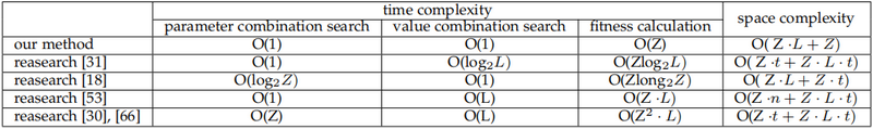 The data in Table. 1 show that the proposed combination location methods and the methods for fitness computation, in comparison with the commonly used approaches for the generation of combinatorial test cases, have the smallest time complexity and the proposed data structure has the smallest space complexity.
