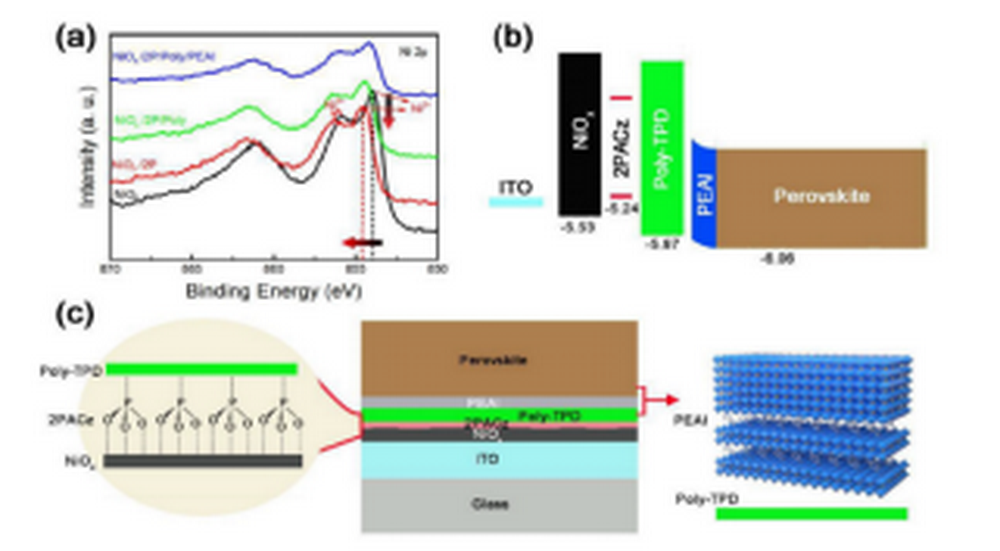 Fig. 2 (a) XPS measurement of Ni 2p3/2 for NiOX, NiOX/2P, NiOX/2PACz/2P/Poly, and NiOX/2PACz/2P/Poly/PEAI. (b) Schematic energy level diagram of NiOx and NiOX/ multi-layer passivation with perovskite. (c) Mechanical explanation of the multi-layer passivation HTLs.