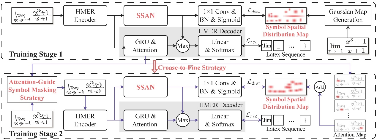 为了解决上述问题,本文提出了预测手写数学公式中符号空间分布图的辅助任务。设计了一个符号空间分布感知网络(SSAN),并与HMER模型进行了联合优化。具体来说,考虑到手写公式图像与其对应的印刷体模板之间符号空间位置分布的相似性,首先根据LaTeX标签生成手写公式图像的印刷体模板,然后用二维高斯分布图替换印刷体模板中的连通域分量,从而得到符号空间分布图。同时,由于手写公式图像和印刷公式图像之间的符号空间分布对齐不紧密,以及存在相似符号的误分类问题,又进一步提出了从粗到细的对齐策略和注意力引导的符号掩蔽策略来解决这些问题。大量实验证明,SSAN能显著提高HMER模型的识别性能,而且与现有的辅助任务相比,所提出的辅助任务能更有效地提高HEMR性能。