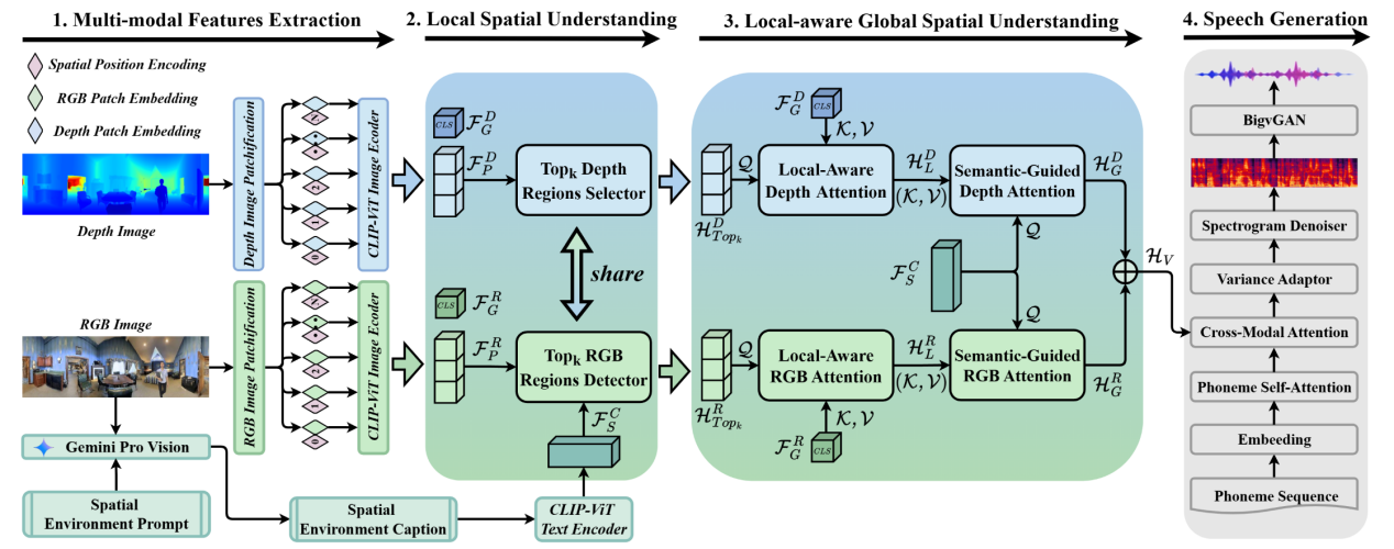 简介:视觉文本到语音合成(Visual Text-to-Speech,VTTS)旨在利用环境图像作为提示,为说话内容合成与空间特性相匹配的混响语音。这一任务的主要难点在于如何准确理解图像中的空间环境信息。虽然目前已有不少研究尝试从图像的RGB空间中提取全局空间信息,但它们往往忽略了局部细节和深度信息这两个对空间环境理解至关重要的线索。为了解决这一问题,我们提出了一种名为M²SE-VTTS的全新多模态与多尺度空间环境理解框架,以实现沉浸式视觉文本到语音合成。多模态旨在融合空间图像的RGB和深度空间以学习更全面的空间信息,多尺度模块则致力于同时建模局部与全局的空间知识。具体而言,我们首先将RGB图像和深度图像划分为若干补丁块,并利用Gemini生成的环境描述来引导局部空间的理解。随后,我们通过局部感知的全局空间理解方式,将多模态与多尺度特征有机结合。这使得M²SE-VTTS能够在多模态空间环境中有效地处理局部和全局空间信息之间的关联。实验结果表明,无论是在客观指标还是主观评估中,我们的模型在环境语音生成任务上都显著优于当前主流的基线方法。