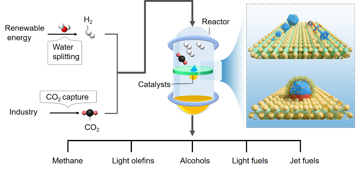 CO2催化加氢可以利用废弃CO2合成附加值化学品,包括C₁产物(如一氧化碳、甲烷、甲醇)和C2+产物(如烯烃、乙醇、汽油、航油等),具有良好的工业应用前景。然而,由于加氢混合物产物的分离成本较高,因此产物的高选择性是实现工艺经济性的关键问题之一。由于CO2加氢反应网络复杂,且催化剂表面存在多种活性位点,产物的选择性调控仍面临挑战。
