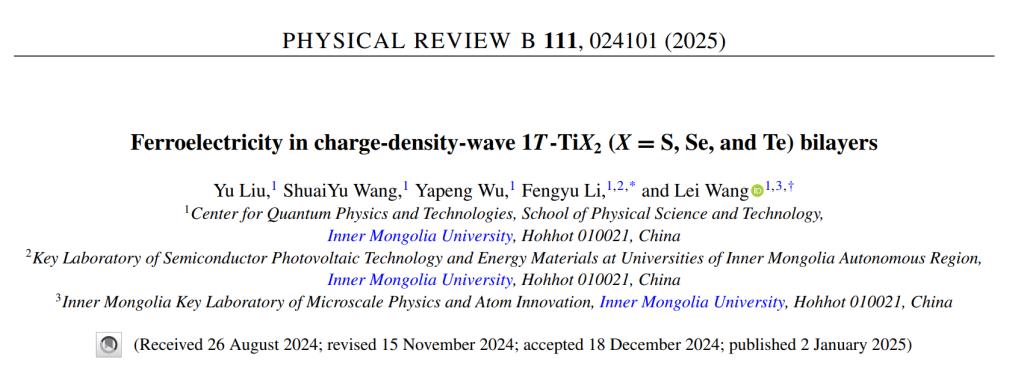 近日,365官网物理科学与技术学院王磊研究员和李锋钰教授指导研究生在电荷密度波和滑移铁电领域取得新进展,相关成果以“Ferroelectricity in charge-density-wave 1T-TiX2 (X = S, Se, and Te) bilayers”为题发表在物理学知名期刊Physical Review B(《物理学评论B》)。(论文链接:https://journals.aps.org/prb/abstract/10.1103/PhysRevB.111.024101)