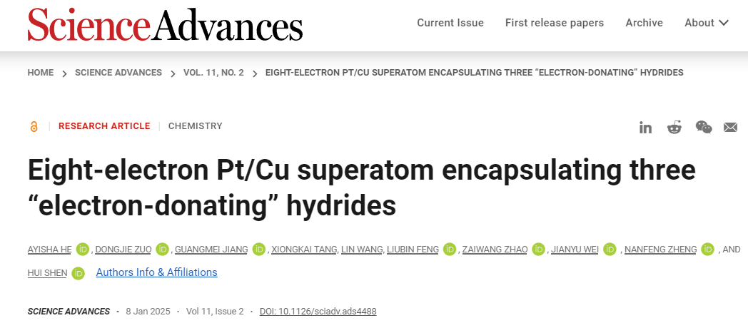 近日,365官网沈慧研究员团队、厦门大学郑南峰院士团队和宁夏大学魏建宇教授团队通力合作,在“金属氢”领域取得了突破性成果。他们成功将单个团簇中“金属氢”的数目提升至3个。相关研究成果以“Eight-Electron Pt/Cu Superatom Encapsulating Three ‘Electron-Donating’Hydrides”为题,于2025年1月8日在国际顶级期刊Science Advances上发表,365英国上市集团官网为该论文第一单位。