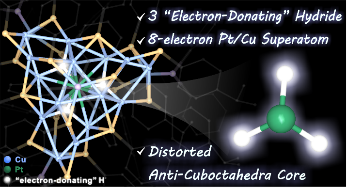 在本项研究中,上述研究团队首先通过对先前大量文献的总结与分析,揭示了传统团簇内核的结构刚性对“金属氢”数目可能存在制约效应。基于此,团队创新提出:通过构建具有更大空间结构的金属内核或许可以容纳更多的“金属氢”,从而突破现有极限。经过长达两年的不懈努力,团队终于成功制备出第一例含有3个“金属氢”的超原子纳米团簇——PtH3Cu23。该纳米团簇的成功合成和详细表征刷新了纳米团簇领域中“金属氢”数目的最新世界记录。