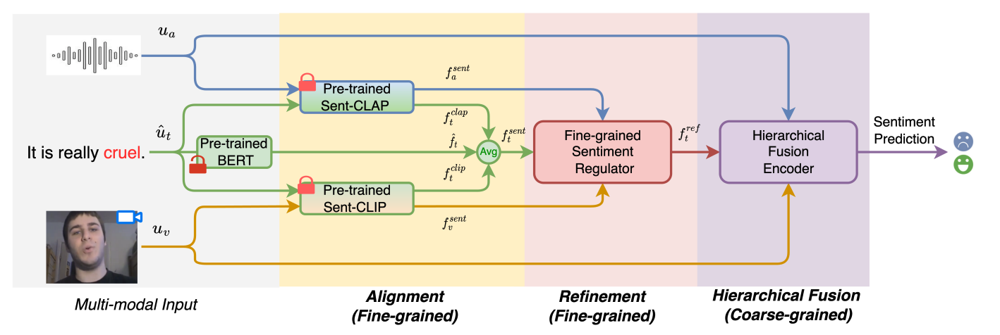 现实场景下多模态情感时第三方语音识别(ASR)引擎可能会错误地就将语句中情感词识别为发音相似的中性词,导致文本信息中的情感退化,从而影响后续多模态情感识别效果。孙启源同学在刘瑞教授的指导下,以第一作者身份完成论文相关工作,提出了“Alignment, Refinement and Fusion” 一站式解决方案,在MOSI-SpeechBrain, MOSI-IBM, MOSI-iFlytek 三个基准数据集上都取得领先效果。以下为成果简述: