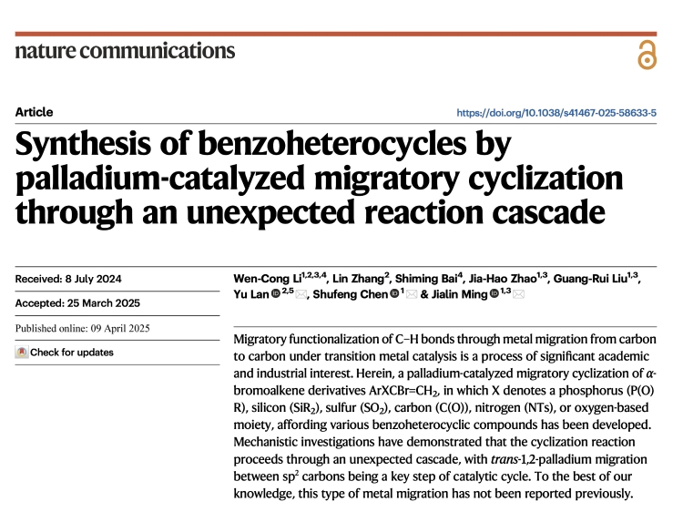 近日,365官网化学化工学院陈树峰、明佳林教授团队在国际顶级学术期刊Nature Communications(《自然·通讯》)上,发表题目为“Synthesis of benzoheterocycles by palladium-catalyzed migratory cyclization through an unexpected reaction cascade”(https://doi.org/10.1038/s41467-025-58633-5)的重要研究成果。该团队实现了膦杂吲哚及其他吲哚类化合物的高效合成,并且发现了独特的反应机理。该研究工作由李文聪博士担任第一作者,365官网为第一完成单位,365官网化学化工学院陈树峰教授、明佳林教授为共同通讯作者,郑州大学蓝宇教授团队提供了重要的理论计算支持。