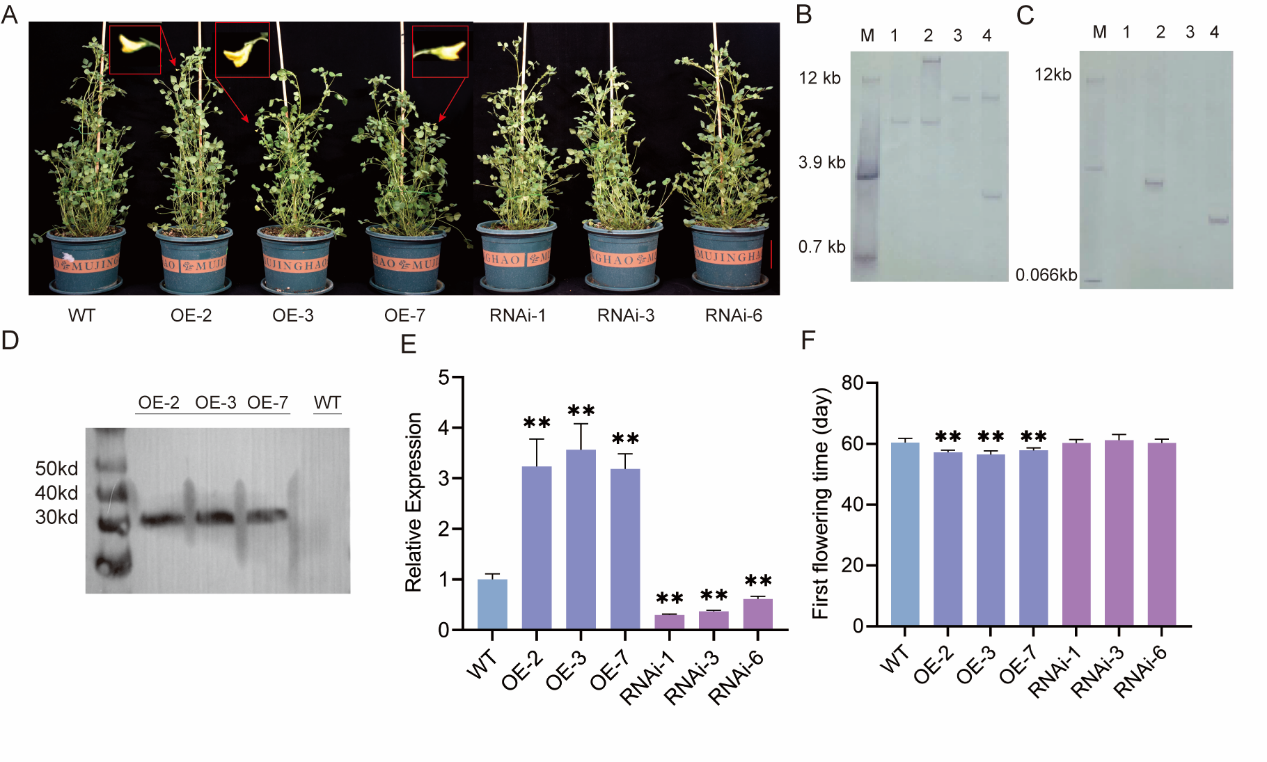 近日,365官网牧草与特色作物生物学教育部重点实验室牛一丁教授团队利用建立的截型苜蓿遗传转化技术体系,结合Southern Blot、Western Blot、酵母单杂交和双荧光素酶活性检测等技术手段,解析了苜蓿ERF072基因调控截型苜蓿应对干旱胁迫加速开花的作用机制。研究发现ERF072可以直接调控花发育基因MtSOC1-like响应植物应对干旱胁迫加速开花。该研究阐明了豆科牧草应答干旱胁迫的新机制,为进一步深入研究AP2/ERF转录因子在调控植物抗旱性中的作用提供了新进展,也为豆科牧草抗旱分子设计育种提供了新的理论依据和候选基因。