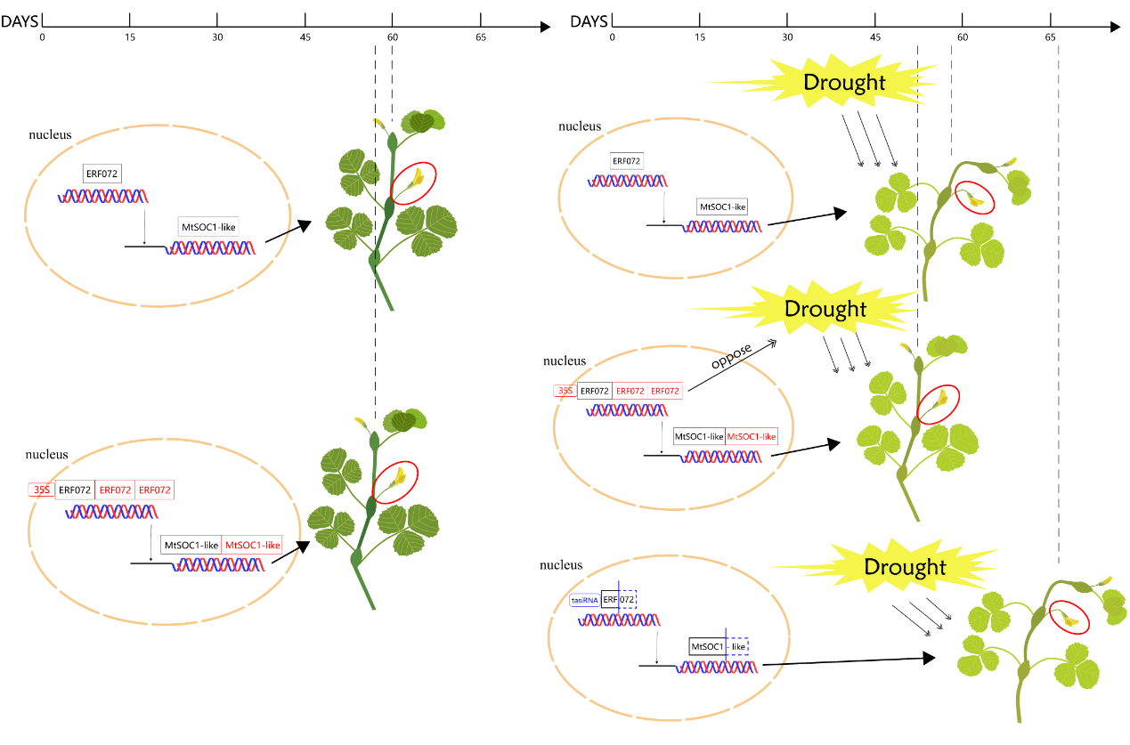 (注:ERF072转录因子与顺式作用元件GGCGGCT 和TCATGTCGA结合,调控下游功能基因的表达。MfERF072 的过表达直接导致受其调控的 MtSOC1-like基因的表达上调,促使截型苜蓿提前开花。在干旱胁迫下,过表达ERF072 的转基因截型苜蓿的开花期显著提前、植株表现出的抗旱性显著增强。DAYS 表示时间轴,红色方框表示表达水平升高,蓝色线条表示表达水平降低,红色圆圈表示首次开花。)
