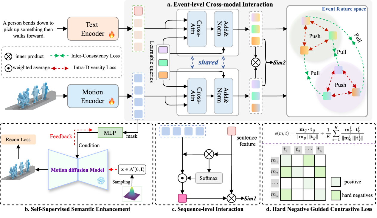 工作简介:文本到三维运动序列检索(TMR)是一项重要的跨模态任务,它旨在检索语义上与给定查询文本相似的运动序列。现有的方法主要利用单个嵌入来表示和对齐文本和运动序列。然而,现实世界中的动作序列通常包含多个具有复杂语义的连续动作,这些动作很难通过单一嵌入精确捕获。此外,仅仅依靠简单的对比训练来获取高层次的语义可能难以感知和捕获精确文本-动作对齐所需的细粒度动作细节。针对上述问题,我们提出了一个运动序列-事件语义一致性学习框架(SECL),从运动序列和动作事件两个语义层面进行语义建模,从而实现了更为详尽的跨模态语义对齐。SECL框架通过扩散模型(Diffusion)的生成反馈机制优化细粒度动作语义捕获,并引入重要性采样策略,强调硬负样本在表征学习中的作用。大量实验结果表明,SECL在两个主流基准数据集上均显著超越现有方法,不仅大幅提升了三维人体运动检索的性能,并在多个相关任务(如多人运动序列交互、三维人体运动时序定位)中展现出强大的泛化能力。