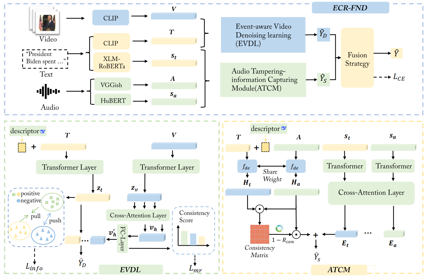 工作简介:短视频平台已成为信息传播的重要渠道,但随之而来的多模态虚假新闻愈发猖獗,对社会舆论造成严重干扰。现有多模态虚假新闻检测方法普遍仅基于简单的多模态特征融合,忽视了真实新闻事件的逻辑一致性和音视频中潜藏的篡改线索,因而检测性能受限。针对这一问题,本文提出事件一致性感知鲁棒虚假新闻检测(ECR-FND) 任务,作为传统多模态检测的扩展,通过深入建模短视频新闻中文本、视频、音频三模态之间的语义一致性与篡改特征,提升检测鲁棒性。为此,我们设计了统一的 ECR-FND 框架,融合事件感知视频去噪学习(EVDL) 与 音频篡改信息捕捉模块(ATCM) 两大关键模块。EVDL 基于大语言模型增强的文本查询,通过跨模态一致性评分,有效剔除视频中与核心新闻事件无关的片段;ATCM则利用文本-音频语义不一致性打分,自适应放大音频中潜藏的篡改特征。为保证检测过程的鲁棒性和精度,我们进一步提出 全局信息感知对比学习 和 情感一致性建模 等优化策略。大量实验结果显示,ECR-FND 在两个主流基准数据集上均显著优于现有方法,不仅提升了对事件一致性的感知能力,也增强了模型对音频篡改的敏感性,从而实现更精准的多模态虚假新闻检测。