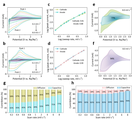 基于此,该团队设计构建了超薄聚吡咯包覆的介孔TiO2微球核壳结构(meso-TiO₂@PPy)。该设计结合了介孔结构的高比表面积和聚吡咯涂层的高导电性,解决了传统TiO2材料在SIBs存储中的瓶颈问题,展现了优异的电化学性能:在1 A g-1的电流密度下,可逆容量高达160.6 mAh g⁻¹,2000次循环后容量保持率为80.8%;在8 mV的扫描速率下,赝电容贡献占比达到94%。密度泛函理论(DFT)计算进一步证实,聚吡咯涂层与TiO2之间的异质结构显著提升了材料的导电性和钠离子吸附能力。这项研究为高性能钠离子电池负极材料的设计提供了思路,通过介孔结构与导电涂层的协同,实现了高能量密度和长寿命,对钠电负极设计具有一定的启示。
